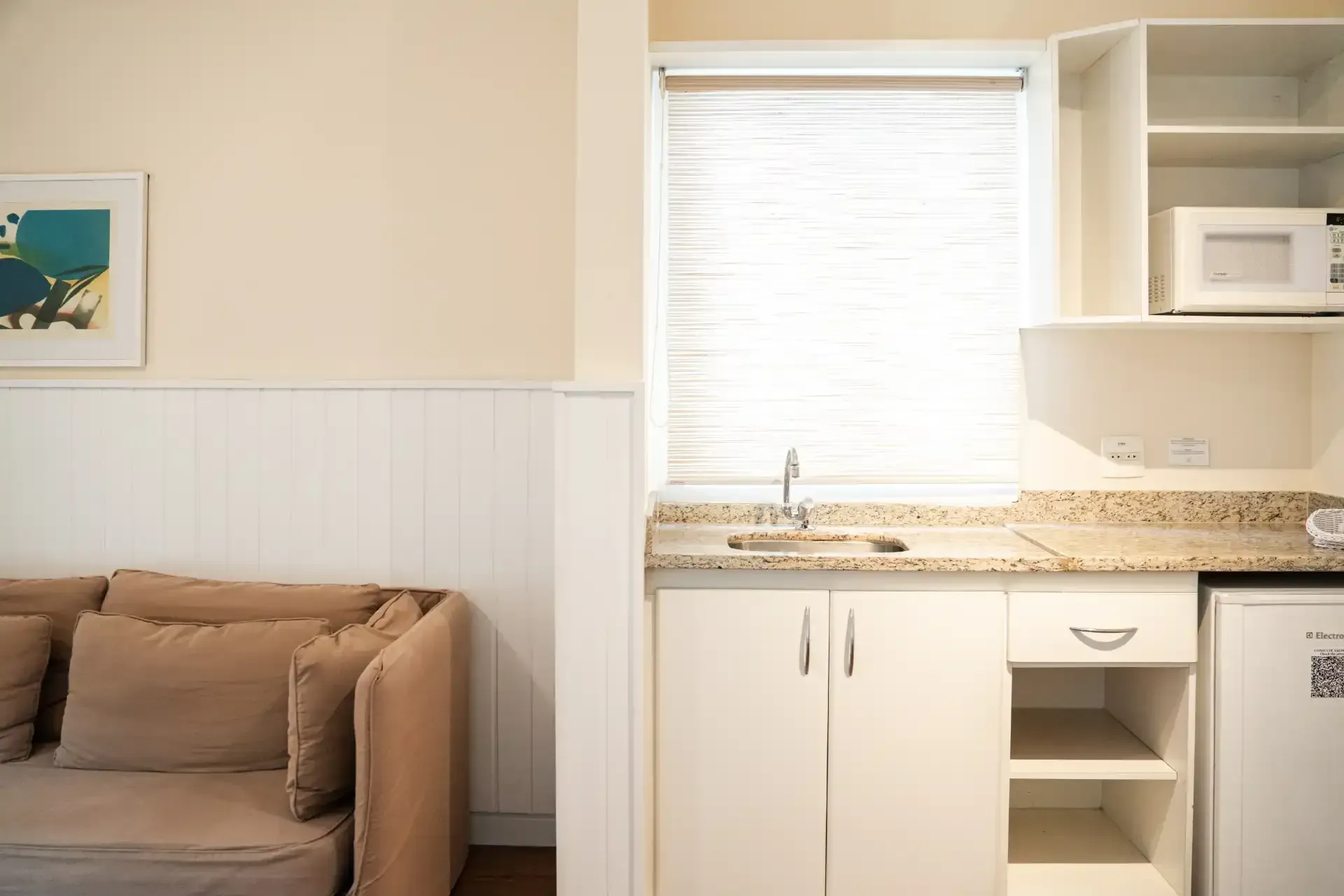 Hotéis no formato Residence ou flat costumam oferecer essa comodidade. O Vitória Residence Newport disponibiliza apartamentos com cozinha americana compacta (antessala, sofá, mesa, pia, microondas, mesa e frigobar), ideal para quem busca mais praticidade.